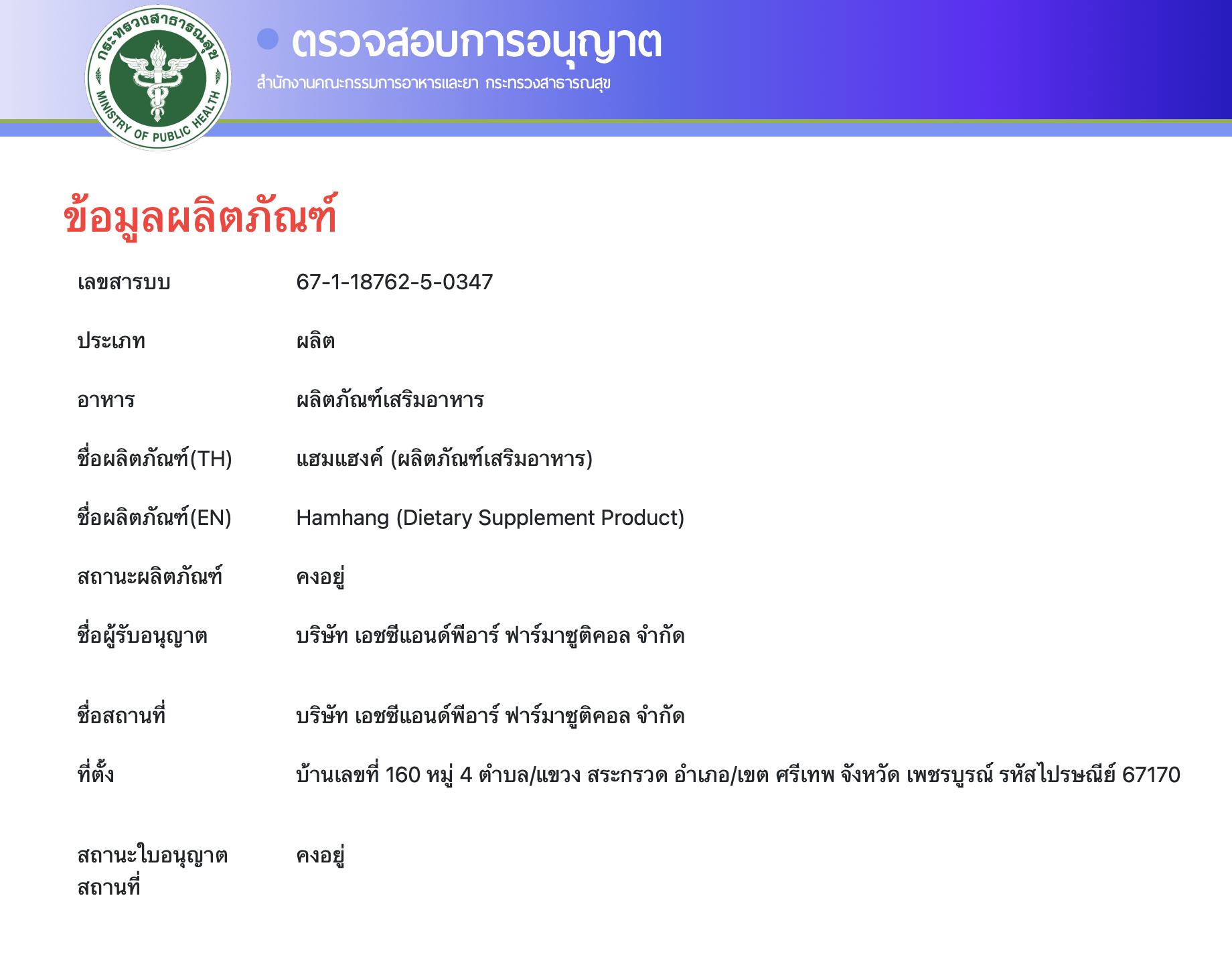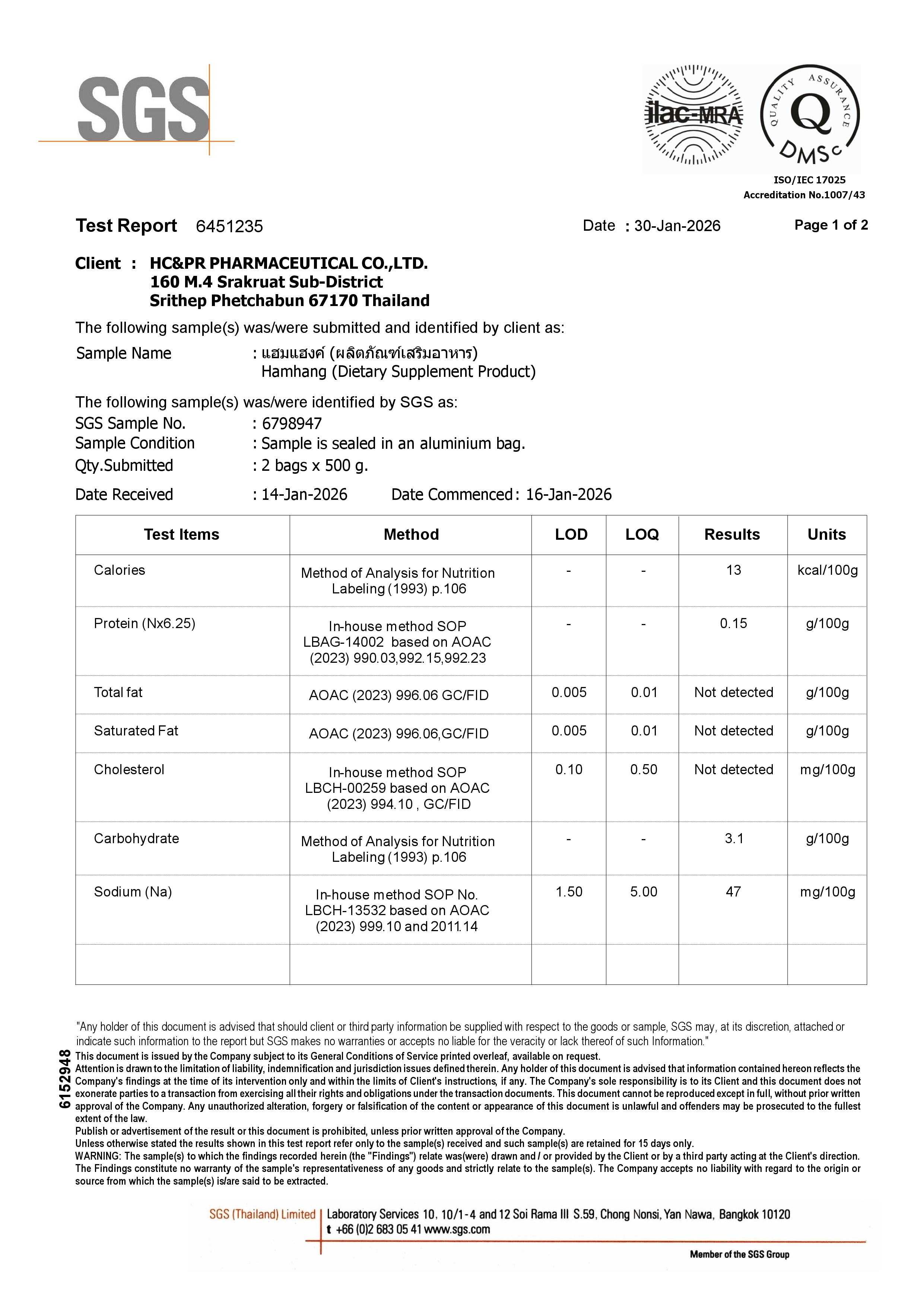 Provide detailed nutrition facts for HAMHANG products, including total energy (calories) and essential nutrients.